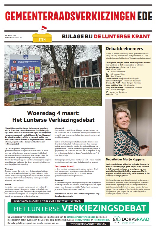 De Lunterse Krant heeft een special uitgegeven die geheel gewijd is aan de komende verkiezingen van de nieuwe Gemeenteraad op 18 maart a.s. Het is een mooie en informatieve bijlage die de opvattingen en beloftes van onze lokale politieke partijen goed weergeeft.